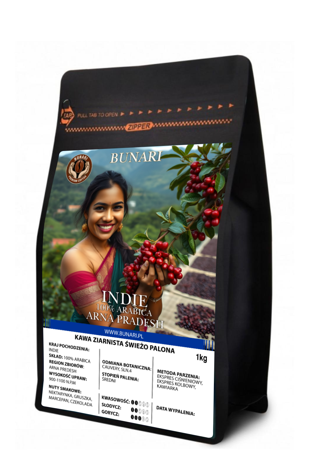 Świeżo palona 100% Arabika pochodząca z Indii, z regionu Arunachal Pradesh, znanego z chłodnego, wysokogórskiego klimatu sprzyjającego równomiernemu dojrzewaniu ziaren. Ziarna odmian Cauvery i SLN 4 dojrzewają na wysokości 1800–2200 m n.p.m., co nadaje kawie czysty i wyrafinowany charakter. Profil smakowy łączy nuty nektarynki i gruszki z akcentem marcepanu oraz delikatnej czekolady. Średni stopień palenia podkreśla naturalną słodycz, subtelną owocową świeżość i elegancką gorycz. Kawa wyróżnia się harmonijną strukturą i długim, czystym finiszem. Doskonale sprawdza się w ekspresach ciśnieniowych, ekspresach kolbowych oraz kawiarce, oferując zbalansowany i aromatyczny napar.
