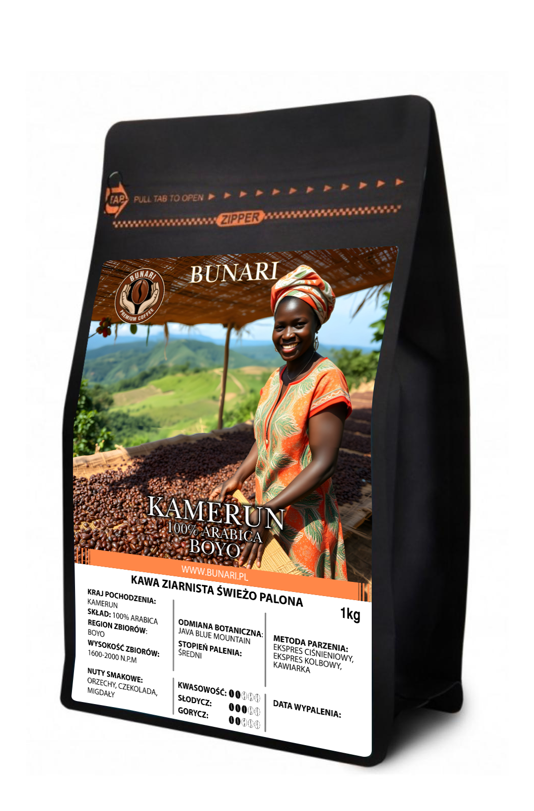 Świeżo palona 100% Arabika pochodząca z Kamerunu, z górskiego regionu Boyo, znanego z chłodnego klimatu i wysokiej jakości upraw. Ziarna odmiany Java Blue Mountain dojrzewają na wysokości 1600–2000 m n.p.m., co nadaje kawie czysty i głęboki profil. W smaku dominują nuty aksamitnej czekolady, szlachetnych orzechów oraz delikatnych migdałów. Średni stopień palenia podkreśla naturalną słodycz, zbalansowaną kwasowość i subtelną, elegancką gorycz. Kawa wyróżnia się kremową strukturą oraz spokojnym, harmonijnym charakterem. Doskonale sprawdza się w ekspresach ciśnieniowych, ekspresach kolbowych oraz kawiarce, oferując pełny i wyrafinowany napar.