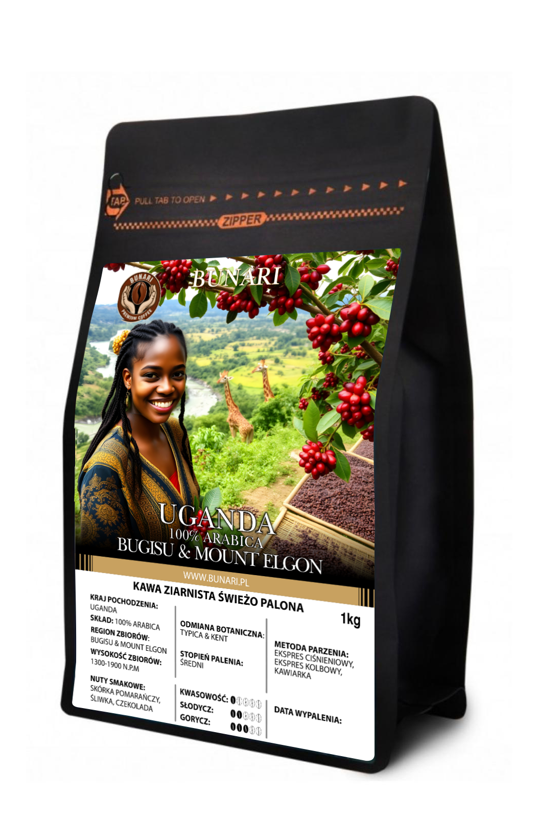Świeżo palona 100% Arabika pochodząca z Ugandy, z regionów Bugisu oraz Mount Elgon, znanych z żyznych, wulkanicznych gleb. Ziarna odmian Typica i Kent dojrzewają na wysokości 1300 – 1900 m n.p.m., co nadaje im intensywny i złożony charakter. Profil smakowy otwierają nuty skórki pomarańczy, przechodzące w śliwkę i gorzką czekoladę. Średni stopień palenia podkreśla naturalną słodycz, niską kwasowość oraz wyraźną, elegancką gorycz. Kawa charakteryzuje się głębią, energią i długim, czystym finiszem. Najlepiej sprawdza się w ekspresach ciśnieniowych, ekspresach kolbowych oraz w kawiarce, oferując intensywny i stabilny napar.