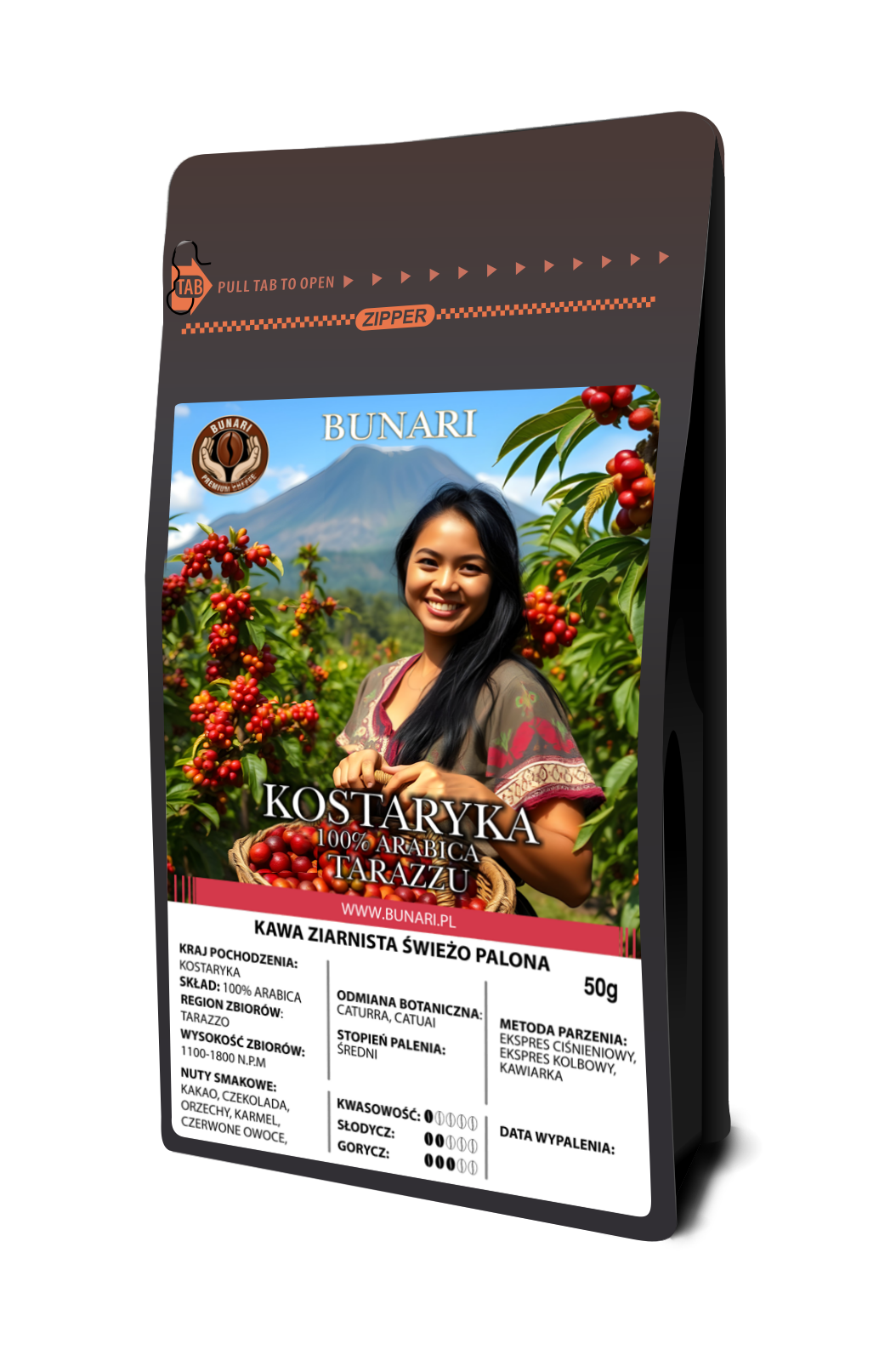 Świeżo palona 100% Arabika pochodząca z Kostaryki, z prestiżowego regionu Tarrazú, uznawanego za jeden z najlepszych obszarów upraw kawy na świecie. Ziarna odmian Caturra i Catuai dojrzewają na wysokości 1100–1800 m n.p.m., co nadaje kawie wyjątkową czystość i głębię smaku. Profil aromatyczny łączy nuty kakao, czekolady, karmelu i delikatnych orzechów z akcentem czerwonych owoców. Średni stopień palenia podkreśla kremową strukturę naparu oraz równowagę między subtelną słodyczą a łagodną goryczą. Kawa charakteryzuje się niską kwasowością i harmonijnym, eleganckim charakterem. Doskonale sprawdza się w ekspresach ciśnieniowych, ekspresach kolbowych oraz kawiarce, oferując pełny i zrównoważony aromat.