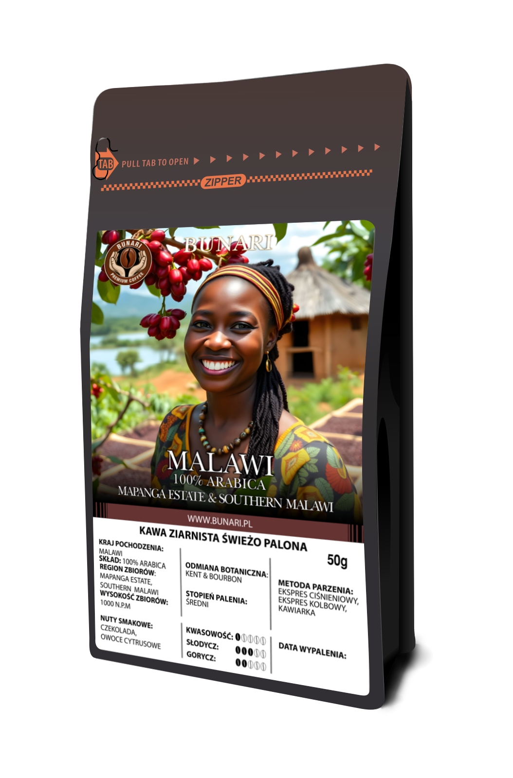 Świeżo palona 100% Arabika pochodząca z Malawi, z regionów Mapanga Estate oraz Southern Malawi. Ziarna odmian Kent i Bourbon dojrzewają na wysokości około 1000 m n.p.m., co nadaje kawie łagodny i harmonijny charakter. Profil smakowy łączy nuty aksamitnej czekolady z delikatną cytrusową świeżością. Średni stopień palenia podkreśla naturalną słodycz oraz subtelną, elegancką gorycz. Kawa charakteryzuje się niską kwasowością i czystym, zrównoważonym finiszem. Doskonale sprawdza się w ekspresach ciśnieniowych, ekspresach kolbowych oraz kawiarce, oferując spokojny i wyrafinowany napar.